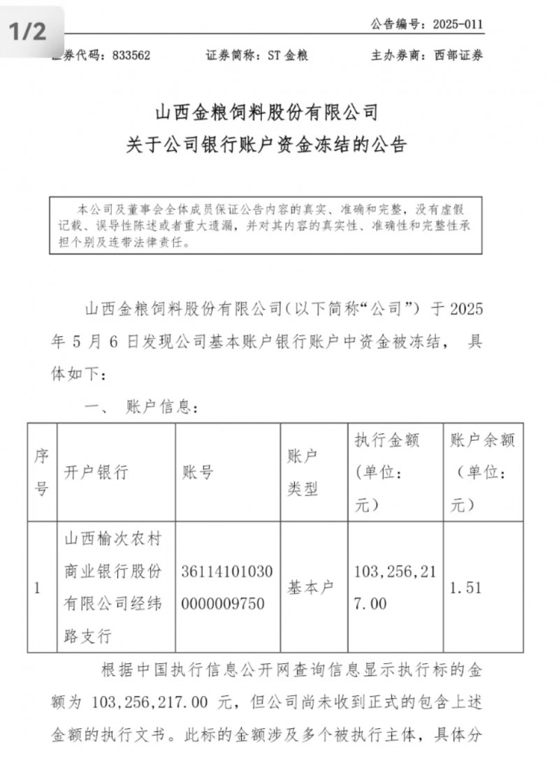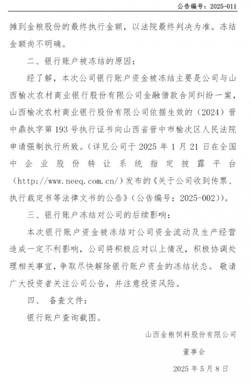 2025年5月9日消息,山西金粮饲料股份有限公司于 2025 年 5 月 6 日发现公司基本账户银行账户中资金被冻结。