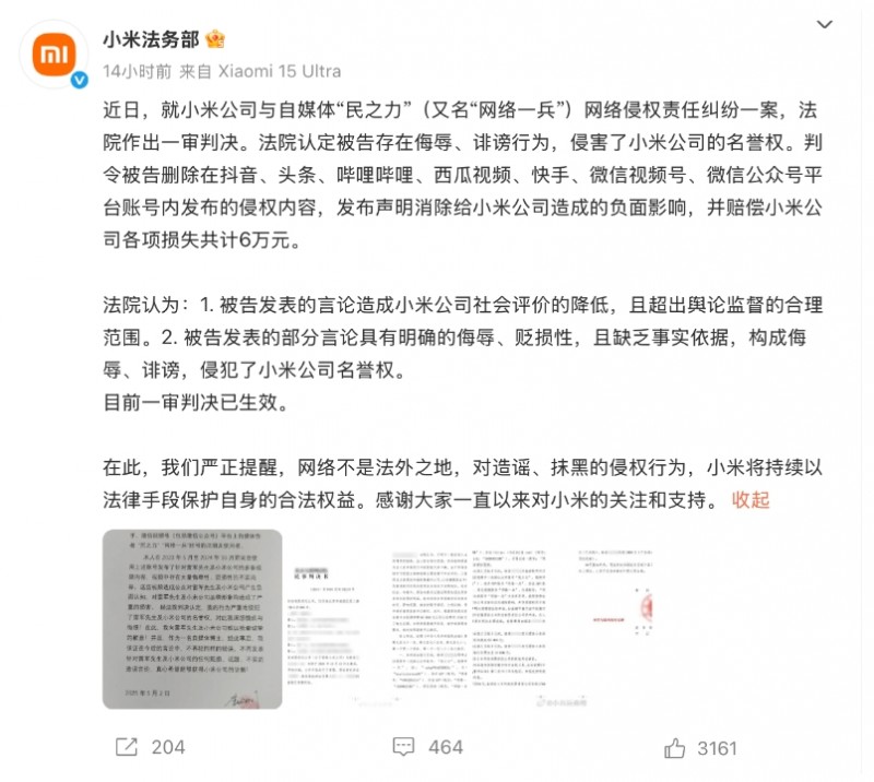 5月14日傍晚,小米法务部在社交平台发文称,近日,就小米公司与自媒体“民之力”(又名“网络一兵”)网络侵权责任纠纷一案,法院作出一审判决。法院认定被告存在侮辱、诽谤行为,侵害了小米公司的名誉权。判令被告删除在抖音、头条、哔哩哔哩、西瓜视频、快手、微信视频号、微信公众号平台账号内发布的侵权内容,发布声明消除给小米公司造成的负面影响,并赔偿小米公司各项损失共计6万元。
