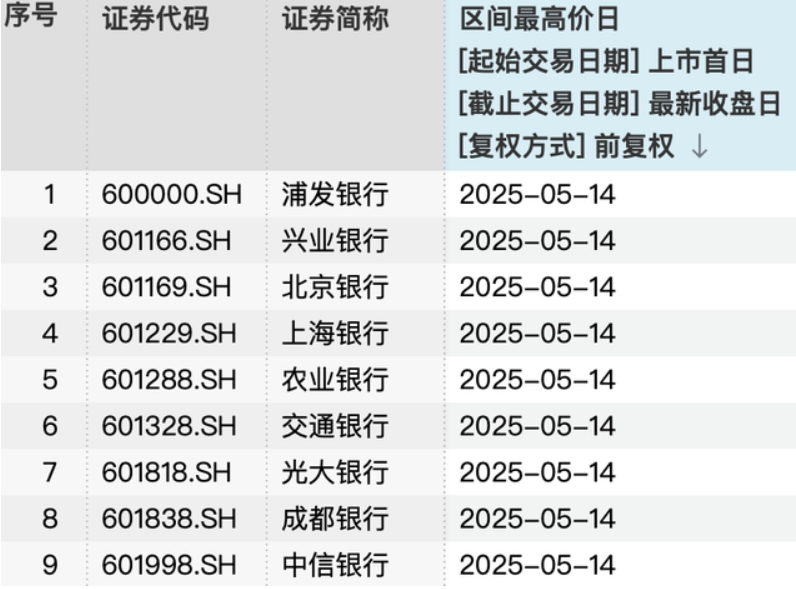银行股更是再度走强,Wind数据显示,浦发银行(600000)、兴业银行(22.890, -0.04, -0.17%)(601166)、北京银行(6.270, -0.06, -0.95%)(601169)、上海银行(601229)、农业银行(5.660, 0.02, 0.35%)(601288)、中信银行(7.620, -0.03, -0.39%)(601998)、交通银行(7.680, -0.04, -0.52%)(601328)、光大银行(4.000, 0.00, 0.00%)(601818)、成都银行(18.400, 0.04, 0.22%)(601838)等9只A股股价在5月14日盘中创出历史新高,宁波银行(26.210, -0.11, -0.42%)(002142)、郑州银行(1.990, -0.01, -0.50%)(002936)、厦门银行(6.140, -0.02, -0.32%)(601187)等周三收盘涨超2%。