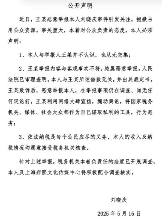 5月15日,演员刘晓庆发布声明称:“本人与举报人王某并不认识,也从无交集。王某举报内容与客观事实不符,纯属恶意举报。”