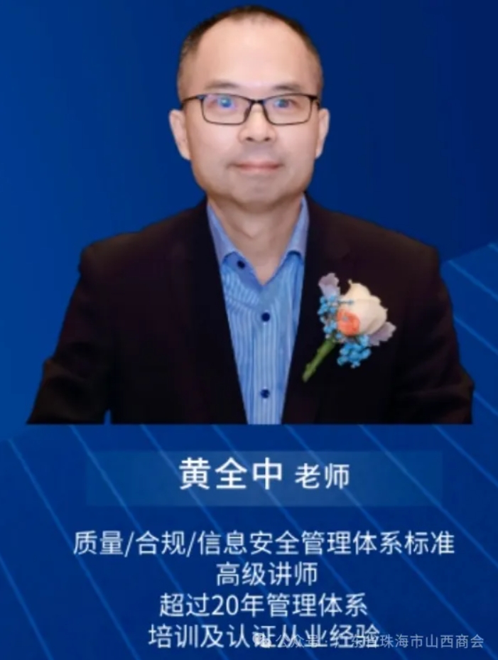 拥有20年管理体系认证经验的高级讲师黄全中,结合典型案例深入浅出解析企业合规化管理要点。从质量、合规、信息安全三大标准体系切入,系统梳理风险防控、制度构建及标准落地的实务路径,助力企业将合规要求转化为核心竞争力。