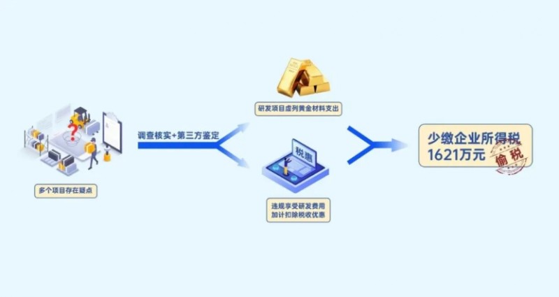 经过对该公司30余个研发项目逐一分析,检查人员发现该公司有多个项目存在用金疑点,部分项目在研发过程中未有使用黄金的流程。同时,结合第三方鉴定机构出具的项目鉴定结果,稽查局最终查实该公司有17个研发项目存在虚列黄金材料支出、违规享受研发费用加计扣除税收优惠问题,共少缴企业所得税1621.16万元。此外,在检查过程中发现该公司还存在其他少缴税款行为。
