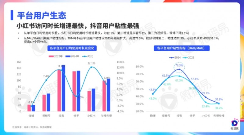 抖音DAU/MAU达76.3%(全平台最高),视频号62.5%次之,小红书用户粘性从32.4%提升至39.1%。
