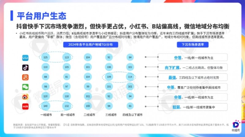 小红书:70%为18-35岁轻熟龄女性,高线城市(一线/新一线)用户TGI指数超130。