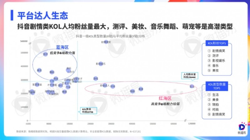 抖音:剧情类KOL人均粉丝量最大,测评、旅行类账号互动率最高,三农、艺术文化类增粉率大。