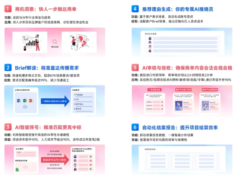 - AI审核与验收:确保商单内容合法合规合格。提前进行内容预审,将审核时间从2小时缩短至2分钟,实现图文/视频违规点AI预检(敏感词/画面/字幕),通过率提升至98%。