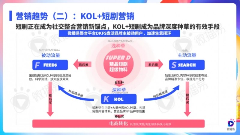 2、KOL+短剧营销:2204年微短剧用户规模已超6亿,优质流量向以短剧为代表的“精致”内容迁移。KOL+短剧成为品牌深度种草的有效手段,微播易整合平台DKFS盘活品牌主被动用户,加速生意闭环。