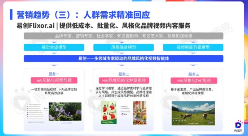 3、人群需求回应:易创AI整合DeepSeek能力,带来低成本、批量化、风格化品牌视频内容服务。具体将延伸为三大场景:AI+KOC种草生产力、AI提升员工营销力、AI+营销裂变增长力。