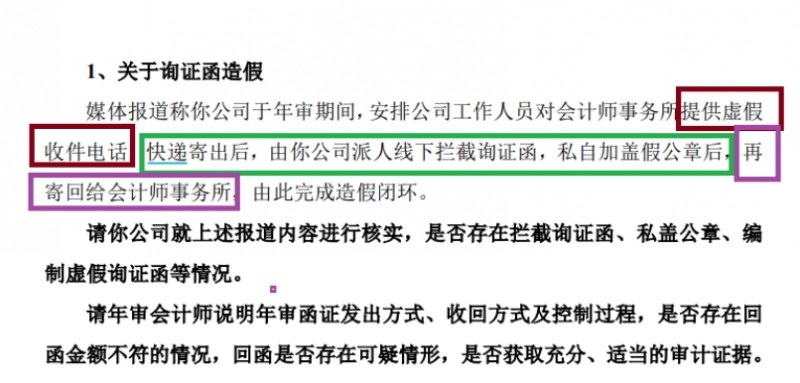 据2024年12月初媒体报道,*ST 广道在年审期间,安排公司工作人员对会计师事务所提供虚假收件电话,派人在线下将会计师事务所对资金往来方发出的询证函快递拦截,私自加盖假公章后,再寄回给会计师事务所,由此完成造假闭环。