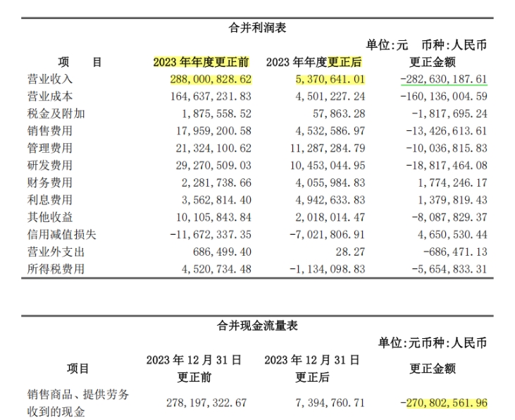 令人感到意外的是,*ST 广道的现金流也出现了大幅变动,一般来说现金流造假难度较大。更正前,公司2023年销售商品、提供劳务收到的现金为2.78亿元,与“虚构”的营收基本一致;更正后,该数据仅为739万元,减少幅度高达97%。