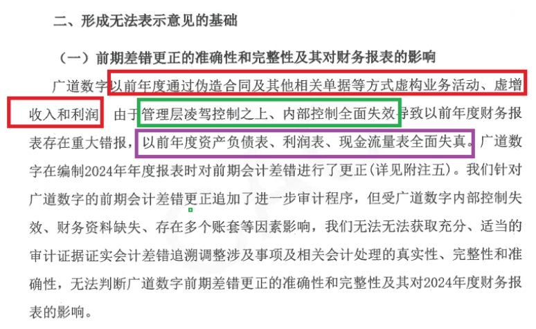 然而,在五矿证券的持续督导期间,*ST 广道2024年被媒体报道涉嫌严重财务造假,因信披违规被立案,还进行了大幅度的会计差错更正,更正后的2023年度营收较更正前少了98%,2024年度财报也被出具了无法表示意见,审计机构措辞严厉直接称存在造假。