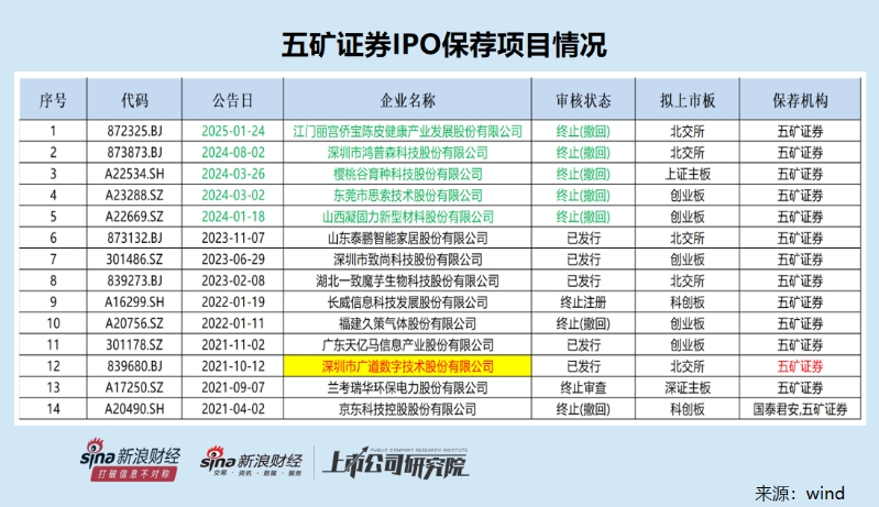 wind显示,2021年11月,五矿证券历史上保荐的首家IPO企业——*ST 广道成功在北交所上市,募资2.05亿元。根据《北交所股票上市规则》的规定,“公开发行并上市的,持续督导期间为股票上市当年剩余时间及其后3个完整会计年度”。2021年11月15日及以后、2022年度、2023年度和2024年度属于五矿证券的持续督导期间。
