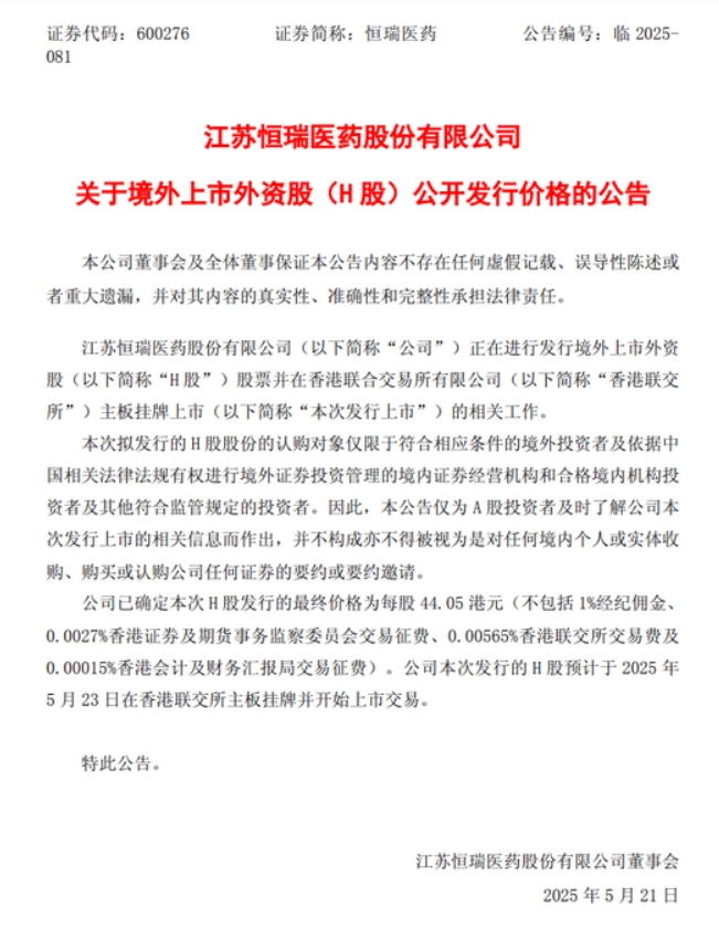 5月21日晚,恒瑞医药(55.790, -0.15, -0.27%)发布公告称,公司已确定H股发行的最终价格为每股44.05港元,该发行价格为预计发行价格的上限。恒瑞医药H股预计将于5月23日在香港联交所主板挂牌交易。