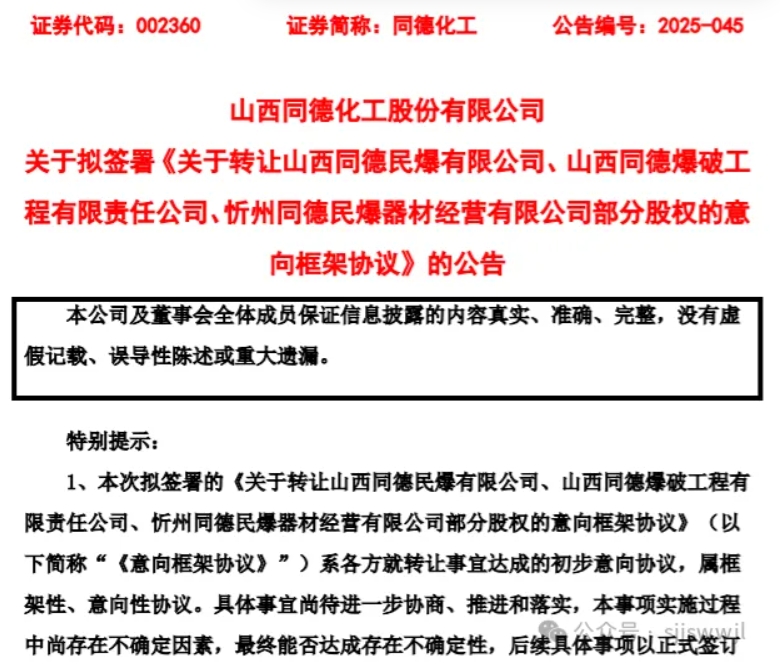5月21日,同德化工发布公告称,同德化工拟与内蒙古生力民爆股份有限公司(以下简称“生力民爆”)签署《意向框架协议》,拟将公司全资子公司山西同德民爆有限公司(含公司拟转入但目前尚未转入山西同德民爆有限公司的与民爆生产经营业务有关的资产、负债及生产许可等)(以下简称“同德民爆”)、山西同德爆破工程有限责任公司(以下简称“同德爆破”)、忻州同德民爆器材经营有限公司(以下简称“忻州同德”)各自不超过45%的股权转让给生力民爆,具体转让方式、转让价格,双方根据审计、评估及后续的内外部审议情况协商确定。
