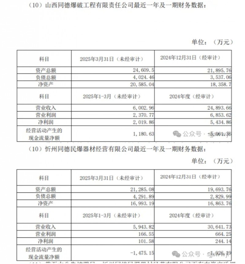 根据公告,今年一季度,同德爆破实现营业收入6002.96万元,营业利润2370.77万元,净利润2019.86万元;忻州同德营业收入5943.82万元,营业利润166.55万元,净利润101.58万元。