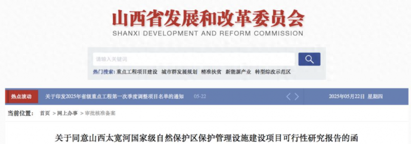 5月22日,山西省发改委正式批复山西太宽河国家级自然保护区保护管理设施建设项目可行性研究报告,计划投资2025万元打造集智能管护、精准监测于一体的现代化生态保护体系,标志着黄河中游重要生态屏障建设迈入科技赋能新阶段。