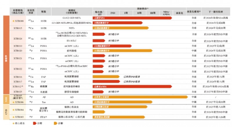 先通医药的管线在战略结构上采用诊断性与治疗用放射性配体的互补组合,涵盖成熟及新兴的靶点与放射性核素。截至2025年5月6日,先通医药的管线聚焦肿瘤学、神经退行性疾病、心血管疾病三大领域并包括15 项资产,包括四种核心产品(XTR008、XTR006、XTR004及XTR003)。在公司的管线资产中,三项处于商业化或临近商业化阶段,八项处于临床或IND支持性阶段,及四项处于研究者发起的试验(IIT)或临床前研究阶段。特別是公司的管线中包含四项潜在同类首创或同类最佳资产,以及四项基于2024 年全球五大畅销放射性药物开发的资产。