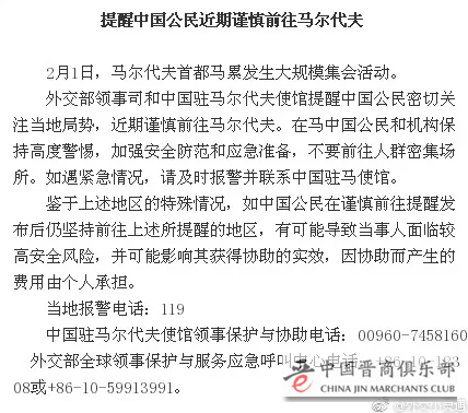 他说,外交部和驻马尔代夫使馆将继续密切跟踪马尔代夫安全形势发展,并视情调整安全提醒级别,请中国公民和机构密切关注。