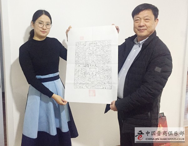 中国晋商俱乐部常务副秘书长马文青向卢洪军副会长赠送了平阳木板年画“财”(由临汾陶唐会馆董事长赵军提供)。