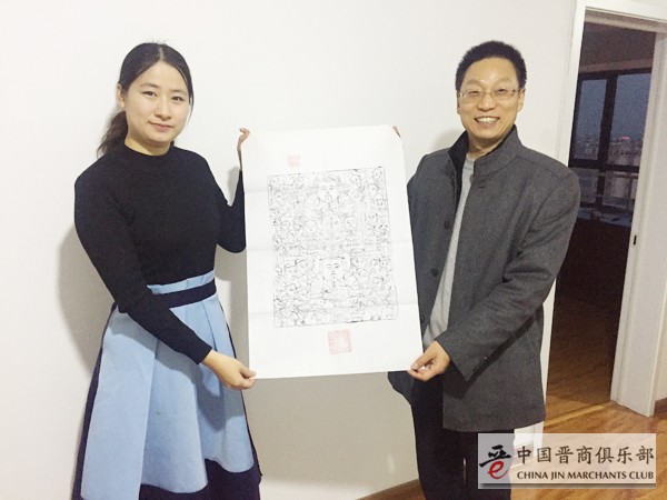 授牌仪式后,马文青向穆志明赠送了平阳木板年画“财”(由临汾陶唐会馆董事长赵军提供)。
