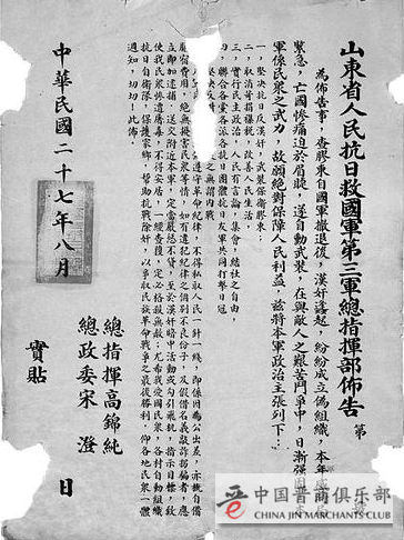 抗战全面爆发后,1937年12月24日,在中国共产党领导下,山东抗日军民举行了声势浩大的天福山武装起义,随后创建了山东人民抗日救国军第三军。这份档案就是“山东省人民抗日救国军第三军总指挥部”在1938年8月发布的一份布告,发布者为当时第三军“总指挥高锦纯 总政委宋澄”。