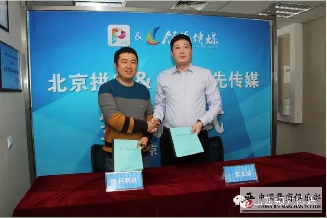 (领先传媒总经理宋总 (右一)与北京拼乐吕总(左一)签约)