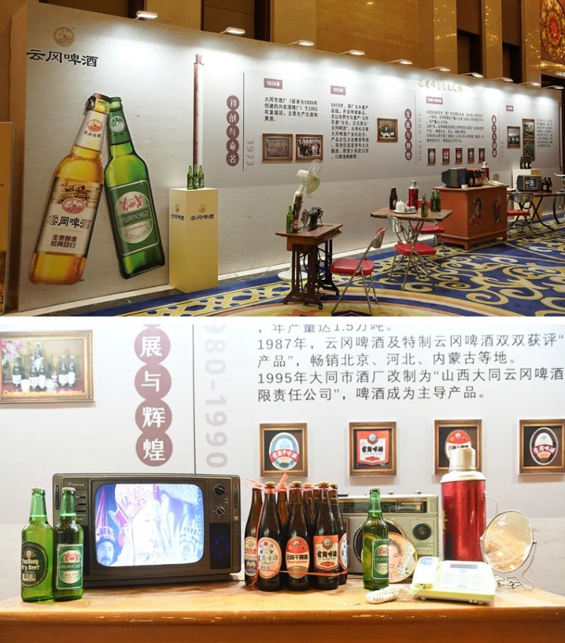 与会人员纷纷驻足展示区,饶有兴致地谈论着云冈啤酒的发展历程。展示区一些上世纪70年代、80年代的复古海报、广告牌和宣传册,吸引了许多与会人员拍照打卡。