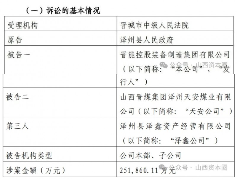 作为晋能控股集团三大核心板块之一,晋能控股装备制造集团是由原省属重点煤企晋煤集团更名组建,并对原同煤、晋煤、晋能、阳煤、潞安等企业装备制造相关资产重组整合成立,而上述诉讼则源于晋煤集团对泽州县内煤矿整合重组。