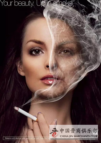 这是世界无烟日的一个广告,将吸烟前后的两张脸放到一起形成了鲜明的对比。