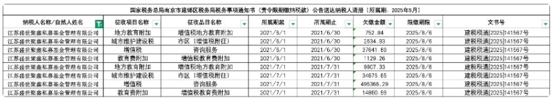 南京建邺区税务局最新发布了5月税务事项通知书(责令限期缴纳税款)公告送达纳税人清册,主要披露了纳税人2021年6月及7月所属期内欠缴的税款。值得注意的是,江苏盛世聚鑫私募基金管理有限公司(以下简称:盛世聚鑫)赫然在列。
