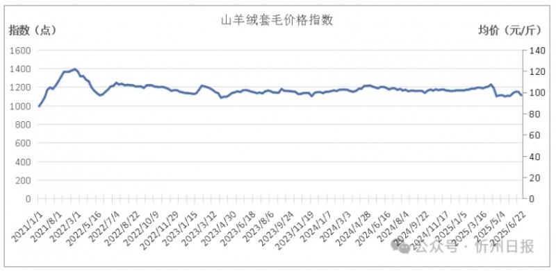 截至6月22日,山羊绒(套毛)价格指数报1119.40点,较上期下跌2.89%,山羊绒(套毛)价格报97.5元/斤,较上期下跌2.9元。