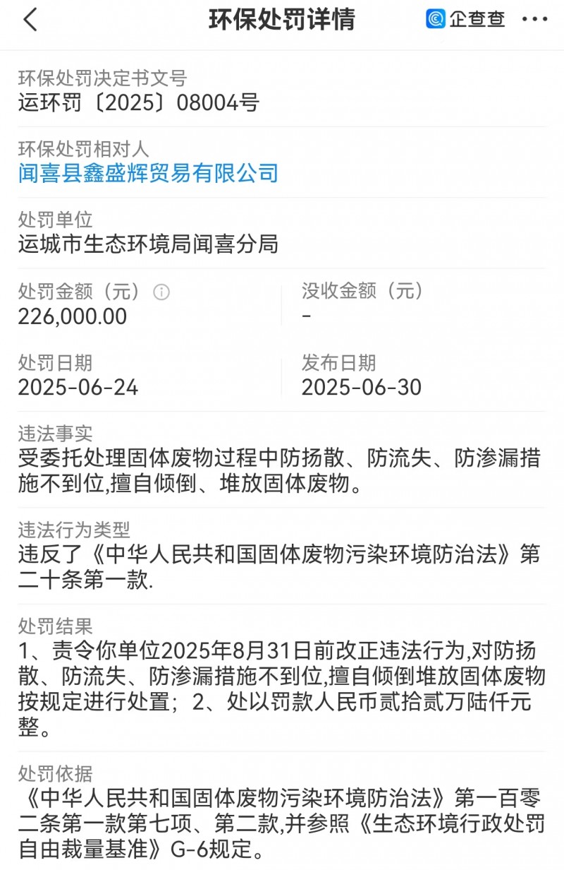 6月24日,闻喜县鑫盛辉贸易有限公司违法事实:受委托处理固体废物过程中防扬散、防流失、防渗漏措施不到位,擅自倾倒、堆放固体废物。