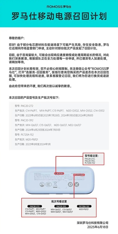 6月14日,罗马仕通过微博发布《公开声明》称,对于近期“北京多所高校禁用罗马仕充电宝”事件的讨论,公司在此郑重承诺,任何经权威机构鉴定存在缺陷的罗马仕产品,公司将依法承担全部责任。6月16日,罗马仕对外发布消息称,按照《消费品召回管理暂行规定》的要求,该公司向深圳市市场监督管理局报告了召回计划。之后,充电宝行业另一知名品牌安克创新也宣布召回充电宝,本次召回总计超71万件。