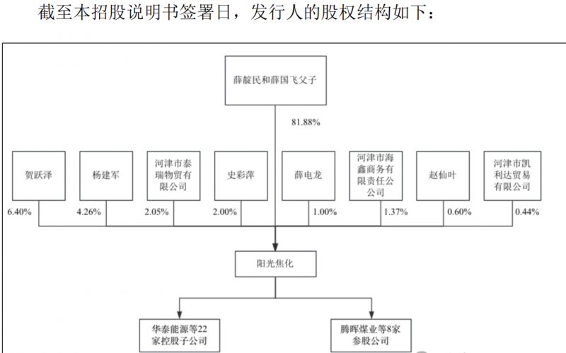 但随后的2008年金融危机和焦化行情低谷等因素影响,阳光集团决定放弃IPO,并于2009年筹划借壳ST金顶上市,但种种原因最终也未能成行。2019年前后,阳光集团再次引入一轮资金。或是因为上市事宜一直未有明确进度,投资人进进出出,截至目前,阳光集团的控股股东、实际控制人为薛靛民、薛国飞父子,合计持有公司81.88%股份。