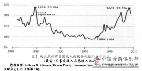 图2:两次危机前美国收入两极分化达到历史高点(最富1%收入占总收入比例)