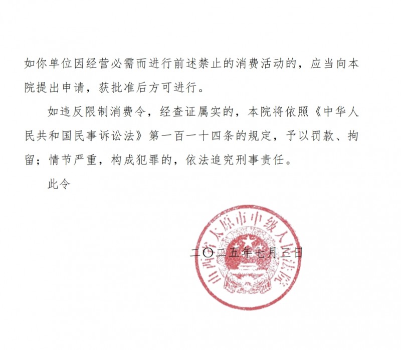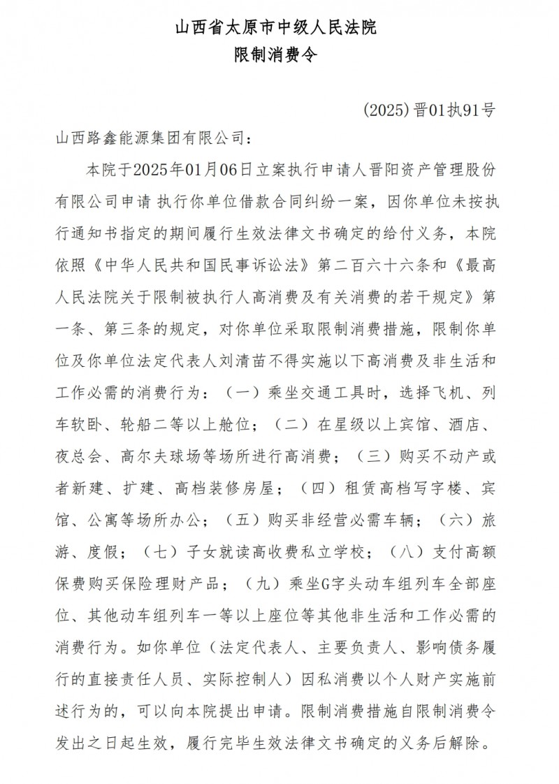 核心提示:7月3日,山西省太原市中级人民法院对山西路鑫能源集团有限公司发布限制消费令,(2025)晋01执91号。