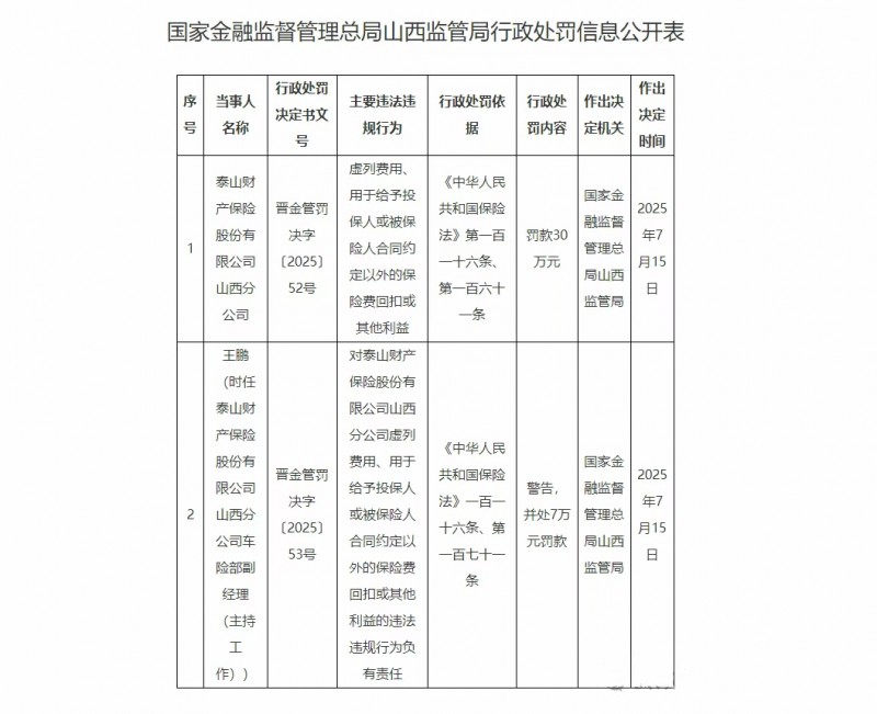 7月22日,据国家金融监督管理总局山西监管局行政处罚信息公开表显示,泰山财产保险股份有限公司山西分公司因虚列费用、用于给予投保人或被保险人合同约定以外的保险费回扣或其他利益,被罚款30万元。