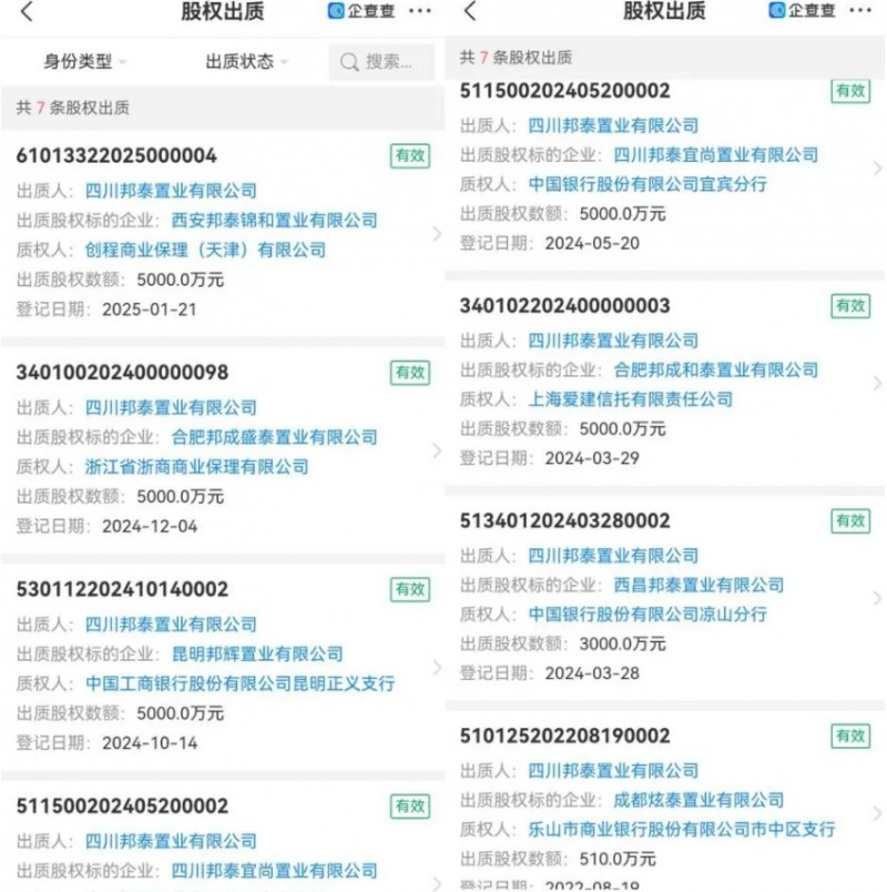 公开信息显示,邦泰置业在2022~2025年间,有7笔股权出质信息,先后将7家子公司作为标的质押给银行或金融公司,金额为2.85亿元。历史出质则超过40笔。