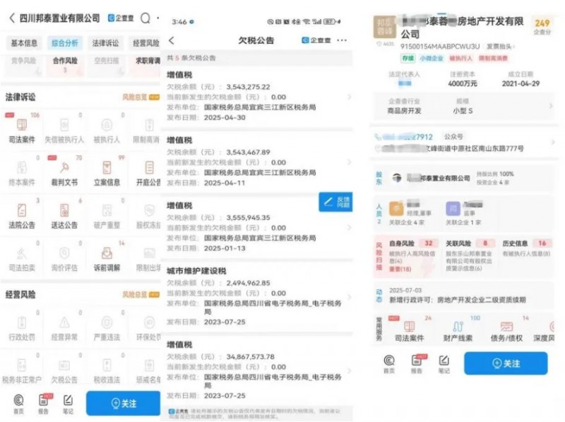 企查查显示,邦泰置业涉及司法案件超百起,立案信息近百条,案由包括合同纠纷、施工违约等;部分公司存在欠税记录、限制高消费,被列为失信被执行人等。如邦泰置业控股的宜宾某公司,欠税记录达5条,2023年的两笔欠税金额合计超3700万元;邦泰置业旗下遂宁、西昌两公司的欠税公告也仍记录在案,金额均超百万元。重庆一公司则被限制高消费8次,列为被执行人4次。