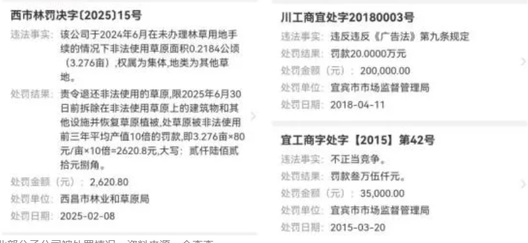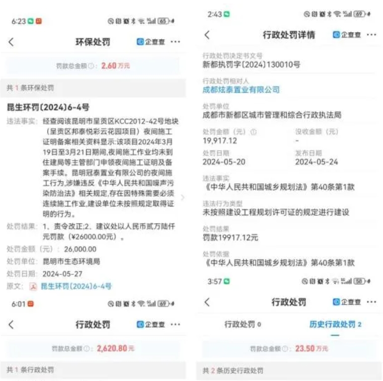 记者还发现,包括邦泰置业在内有众多公司在项目开发过程中都曾被当地职能部门处以行政处罚或环保处罚,内容包括“销售宣传与实际不符、未按规定修建擅自施工、无证非法使用土地”等。2024年5月,成都某置业公司就因未按规定建设被当地综合行政执法局罚款近2万元;昆明某置业公司也因无证施工被当地生态环境局罚款。