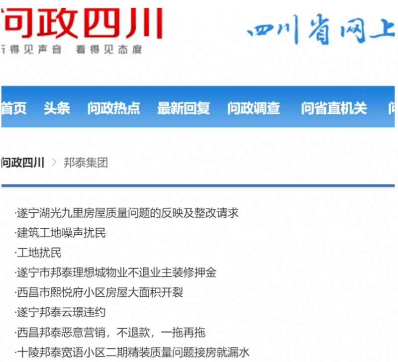 邦泰集团部分项目被投诉情况。资料来源:问政四川平台