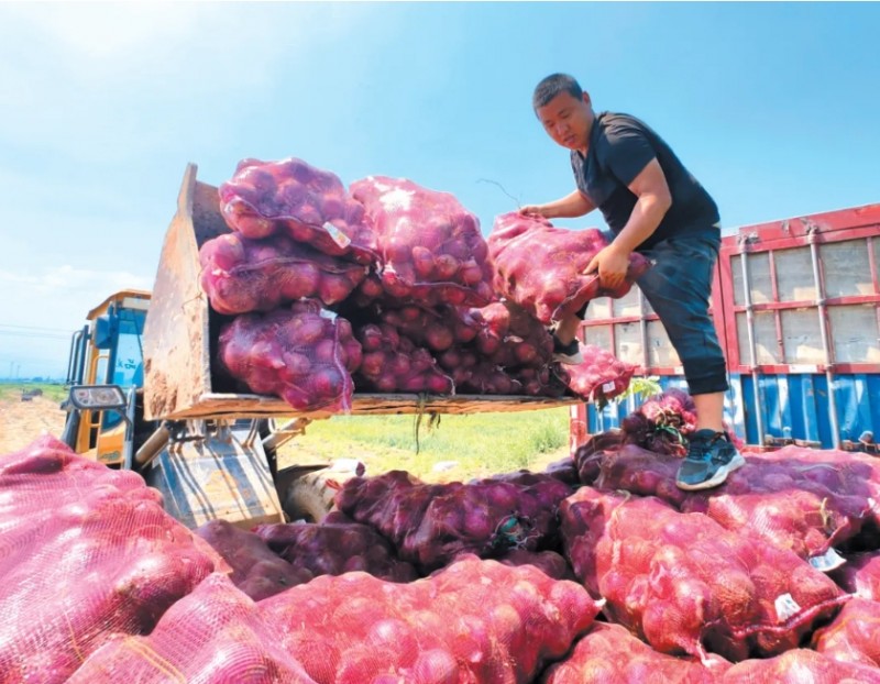 丰收并非偶然。村民赵梅娥直起身,用毛巾擦拭额头的汗水,笑意盈盈地说:“今年天公作美,雨水匀称,洋葱个头普遍大、品相好,加上董村镇农技专家从年初就定期下来指导,从育苗到田间管理,全程把关,才有了这好收成,看着心里就踏实!”