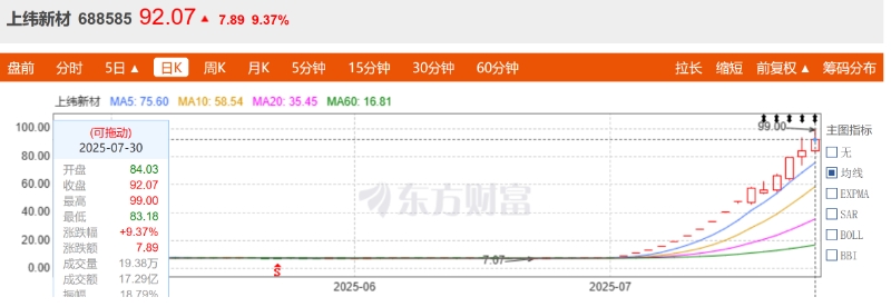 自7月9日起,上纬新材股价如脱缰野马一般,截至22日连收10个涨停板,23日后虽上涨幅度有所放缓,但股价仍持续疯狂上涨。截至7月30日收盘,上纬新材股价92.07元/股,总市值371.4亿元。