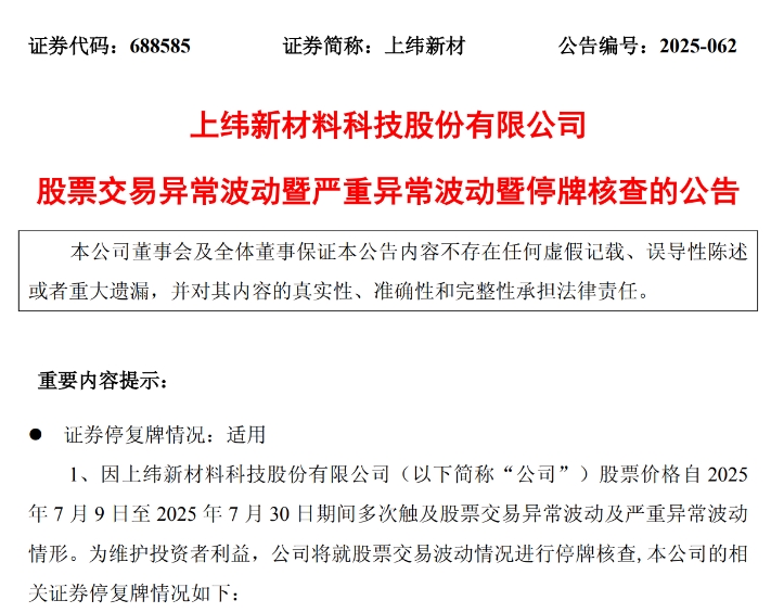 7月30日晚间,上纬新材发布公告称,、因公司股票价格自2025年 7 月 9 日至 2025 年 7 月 30 日期间多次触及股票交易异常波动及严重异常波动情形。为维护投资者利益,公司将就股票交易波动情况进行停牌核查。
