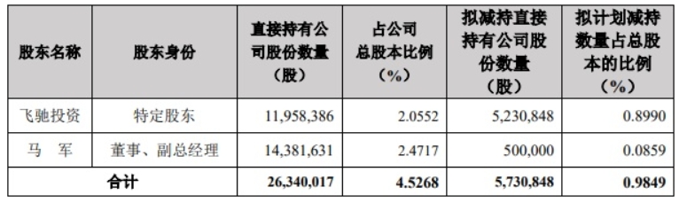 特定股东飞驰投资是公司首次公开发行股票上市前为骨干员工设立的员工持股平台,持有公司股份11,958,386股,占公司目前总股本的2.0552%(以2025年7月29日公司总股本58,186.3431万股为基数,下同),公司控股股东、实际控制人马飞担任其执行董事。飞驰投资拟于公告披露之日起15个交易日后的3个月内(自2025年8月20日至2025年11月19日)以集中竞价或大宗交易方式减持公司股份不超过5,230,848股,占公司目前总股本的0.8990%,本次减持主要是基于员工个人的资金需求。
