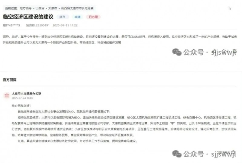 近日,有网友在领导留言板发起了关于太原的临空经济区建设进展问题的提问: