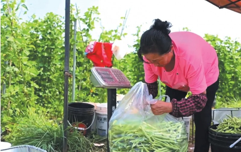 同是种植户的贺喜花乐得合不拢嘴:“我们改进了传统搭架方式,采用铁杆和绳索组合支撑,让豆角能够垂直生长。”顶着烈日,贺喜花介绍新技术带来的变化,“你看这些豆角笔直饱满,品相好自然能卖上好价钱。”