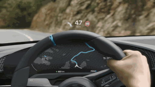 显示屏启动,自动起飞。起飞后,智能围绕行驶路线,将周围的地形、车流等,实时传到车内。