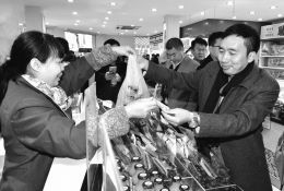 11月29日上午9点,记者在上海邵万生洋泾镇社区店看到,夺人眼球的“山西省名优特商品(上海)展销专柜”红底白字的条幅高高悬挂在该店的正上方,云集着老陈醋、苦荞茶、亚麻籽油、沁州黄小米、沙棘汁、糯玉米、香菇酱、优质枣类等山西名优特产品,在组合而成“口”字型的山西特产专柜柜台上,摆放得错落有致,晋风晋韵与沪上名品同台竞技,共赢发展。占据了邵万生老店中心位置的山西特产,因为独具环保、健康、有机等特点,深受重视养生的上海消费者的青睐。