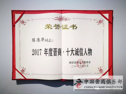 本次表彰设有“十大诚信人物”、“十大新锐人物”、“十大巾帼人物”三个奖项,经过申报、初审、公示、网上投票、专家评审四个阶段,30名民营经济企业家脱颖而出。其中,山西省广东商会(中国晋商俱乐部联合发起机构)永久荣誉会长陈浪华被评选为“晋商·十大诚信人物”。陈浪华先生的代表郭金虎代其领取奖项和证书!